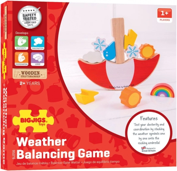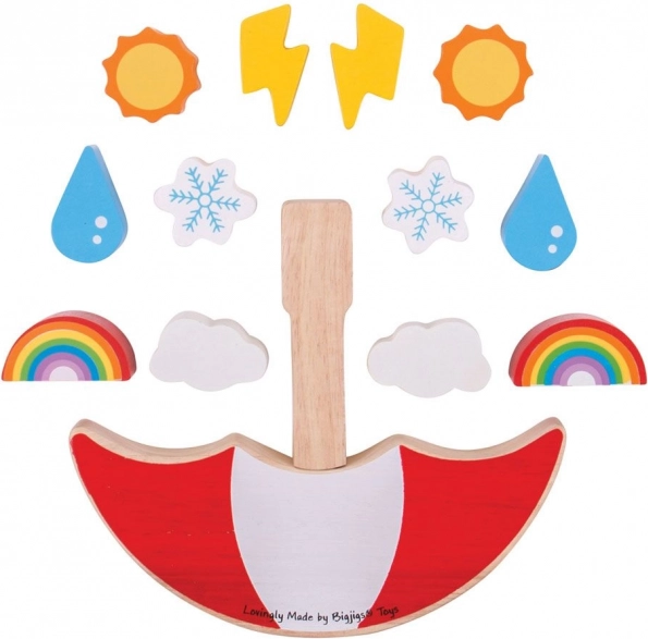De set bevat 13 onderdelen, waaronder iconische weersymbolen: regenboog, bewolking, sneeuwvlok, druppel, zon en bliksem. Heldere kleuren ondersteunen het herkennen van kleuren en vormen, verantwoord verkregen hout zorgt voor duurzaamheid en een prettig gevoel. Het spel voldoet aan de Europese veiligheidsnormen en is een uitstekende keuze voor kinderen vanaf 2 jaar.