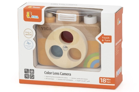 Houten camera met kleurrijke lens voor kinderen