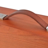 Stabiele en stijlvolle koffer met een afwerking van gepolijst hout biedt ruimte voor veilige opslag van alle hulpmiddelen.