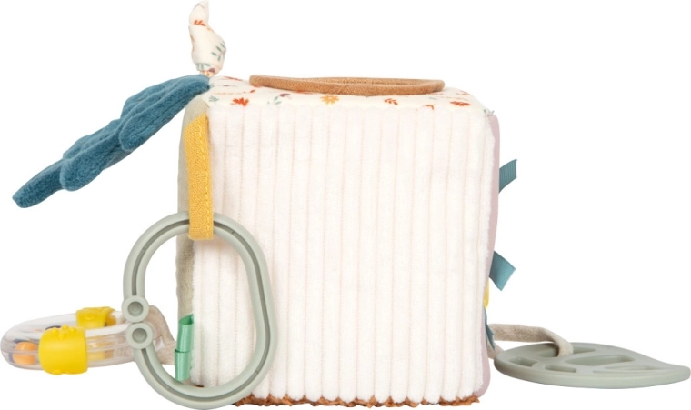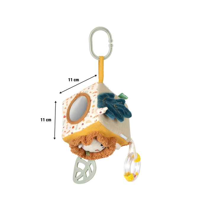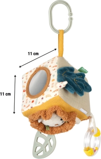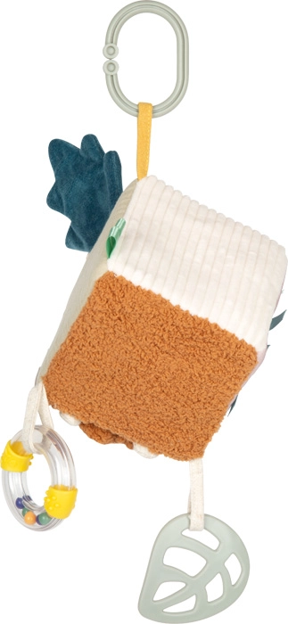 Dankzij de zachte vulling en de compacte afmetingen is hij ideaal voor kleine handjes: stimuleert grijpen, knijpen en draaien, wat de fijne motoriek op natuurlijke wijze ontwikkelt. De praktische lus maakt het eenvoudig om de kubus aan een kinderwagen, autostoeltje of speelboog vast te maken, zodat hij ook onderweg altijd binnen handbereik is.