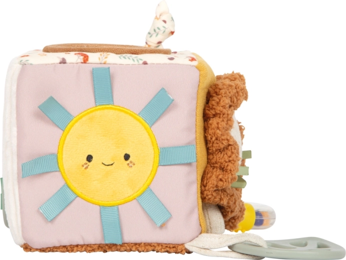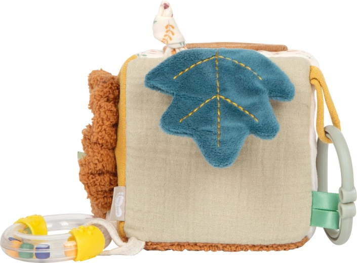 Deze multifunctionele stoffen activiteitenkubus met een leeuwtje boeit baby’s met gevarieerde texturen, geluiden en vormen. Elke zijde biedt een andere prikkel – van het zachte rinkelen van een belletje en het rammelen van kraaltjes tot knisperende vlakken en een veilige bijtring die verlichting geeft bij doorkomende tandjes.