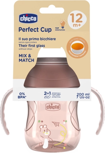 Leer je kind zelfstandig drinken met de CHICCO Perfect Cup 360°. Dankzij de 360°-rand met siliconenmembraan drink je als uit een glas, maar zonder te morsen. Afneembare handvatten passen in kleine handjes, de transparante membraan helpt het kind de vloeistofstroom te zien en na het verwijderen verandert de beker in een open glas. BPA-vrij, inhoud 200 ml, ideaal vanaf 12 maanden.