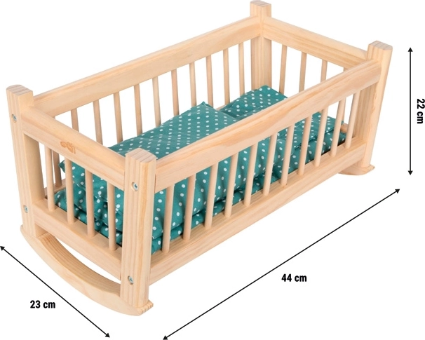Deze natuurlijke houten wieg is een ideale aanvulling voor de kinderkamer en het poppenhuis. Het stabiele wiegframe zorgt voor een gelijkmatige schommelbeweging die poppen en pluche vriendjes tot 39 cm kalmeert. De bijpassende textielset in subtiel design biedt maximaal comfort.