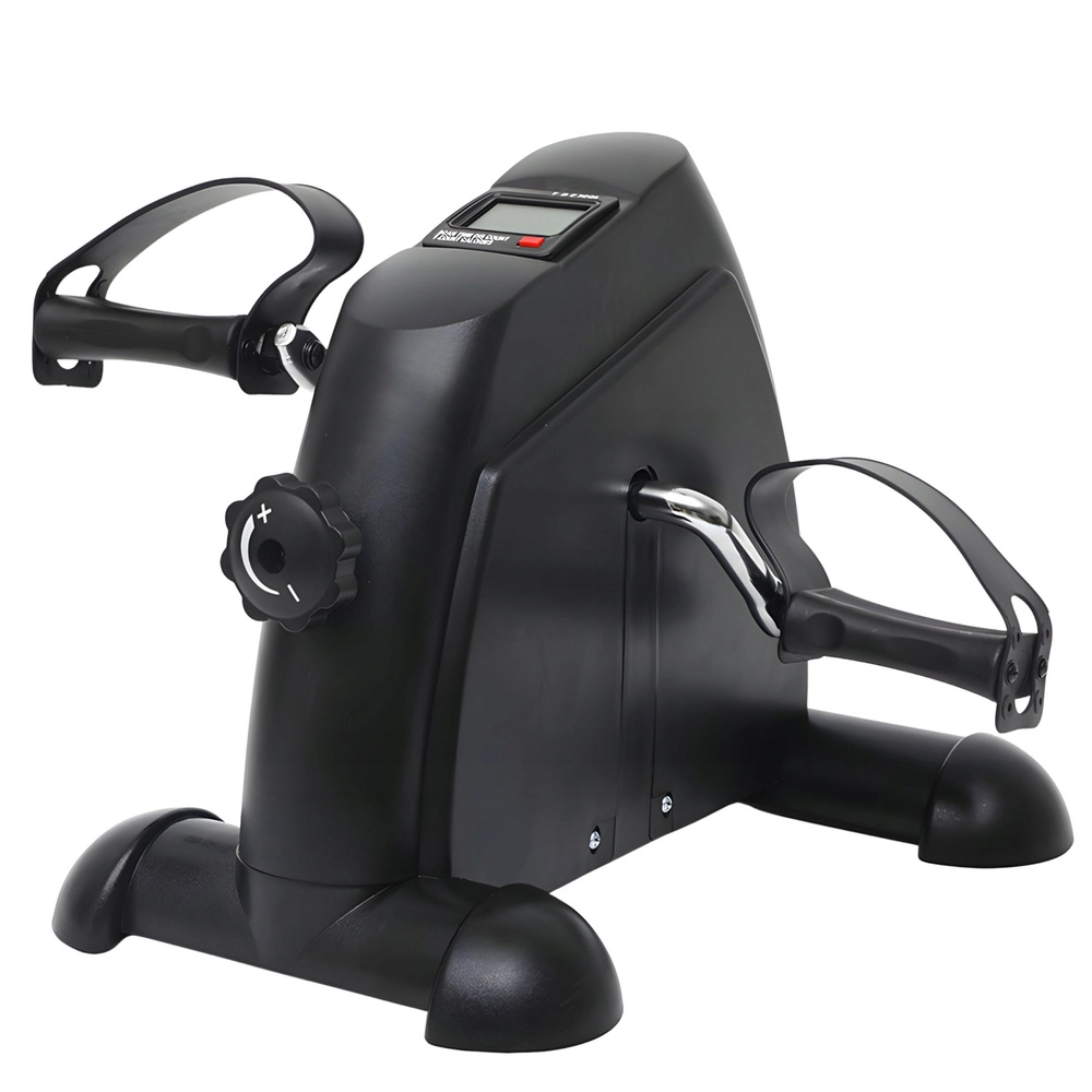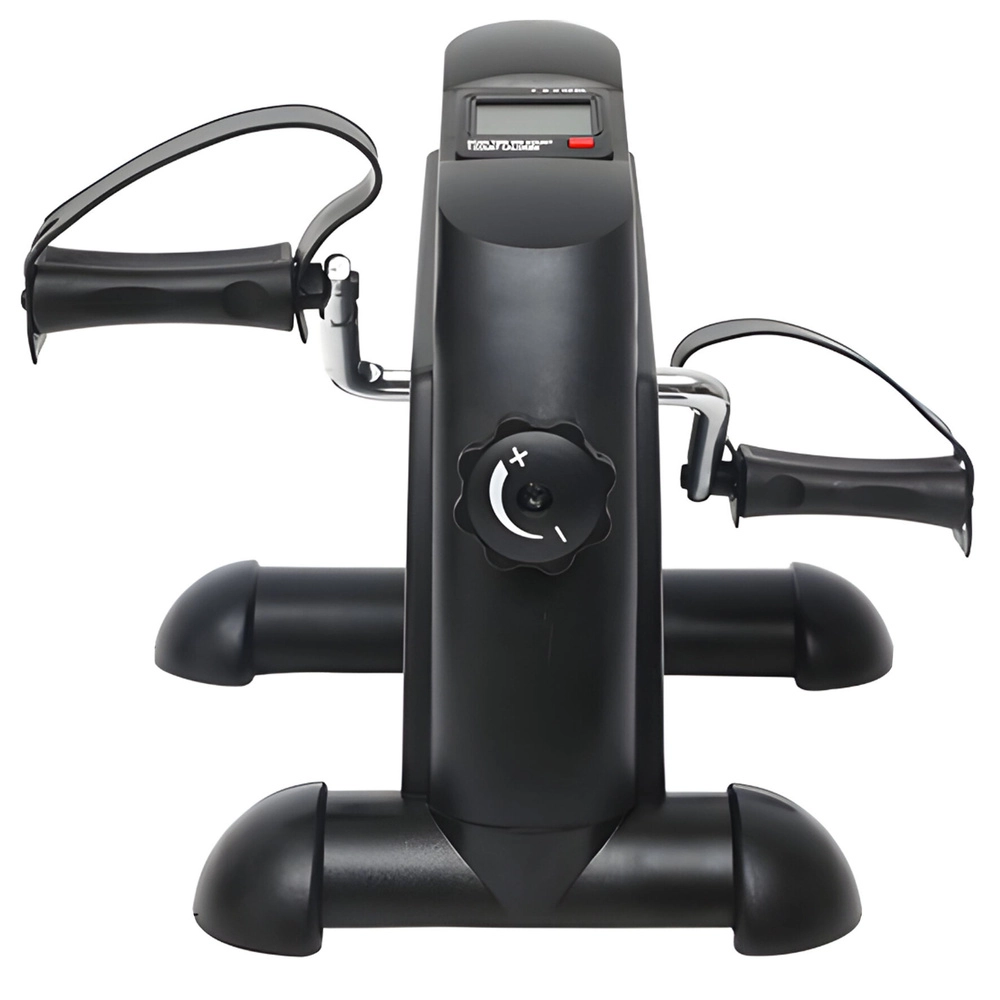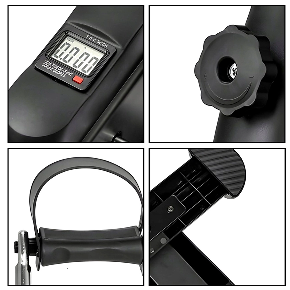 Het geïntegreerde LCD-display toont de belangrijkste statistieken – tijd (TIME), calorieën (CAL), aantal omwentelingen (CNT), omwentelingen per minuut (RPM) en de SCAN-functie. Een stevige, brede basis, antislipvoetjes en verstelbare pedalenriempjes zorgen voor zekerheid bij trappen op de vloer en bij draaien met de handen op tafel.