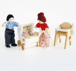 Schattige houten set voor fantasierijk spel met een baby van het merk LE TOY VAN. Bevat een wandelwagen, een kinderstoel, een eetset en een tas. De textiele accessoires zijn met de hand genaaid en alle onderdelen zijn gemaakt van hoogwaardig rubberhout. Het speelgoed is afgewerkt met niet-giftige verf op waterbasis, is ethisch geproduceerd en stimuleert creativiteit, fijne motoriek en coördinatie.