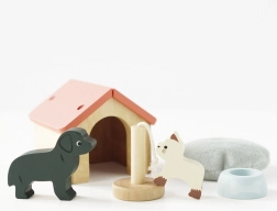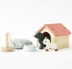 Breid de kinderfantasie uit met een schattige set houten huisdieren – een hondje en een katje met hok en accessoires. Deze hoogwaardige aanvulling voor poppenhuizen en speelscènes stimuleert sociaal spel, communicatie en verbeeldingskracht. Gemaakt van FSC-hout, met de hand nabeschilderd met niet-giftige verf op waterbasis en ontworpen om lang mee te gaan.