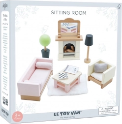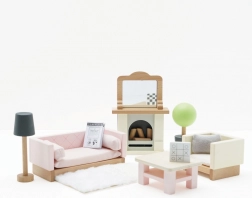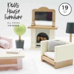 De set bevat 19 onderdelen: een sofa en fauteuil met stoffen kussens, een salontafel, een open haard met houtblokken en spiegel, een tapijt, een plant in pot en een lamp. Qua formaat geschikt voor de poppenhuizen van Le Toy Van. Meer Daisylane-poppenhuisaccessoires zijn beschikbaar op onze website.