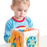 De motorische kubus Le Toy Van Petilou is niet alleen esthetisch aantrekkelijk dankzij de levendige kleuren en precieze illustraties, maar ook praktisch voor de ontwikkeling van kindervaardigheden. Bevat: