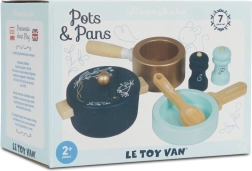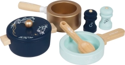 Stijlvolle houten kookset voor kleine koks vanaf 2 jaar. Bevat een pot met deksel, steelpan, koekenpan, spatel, zoutstrooier en peperstrooier. Gemaakt van FSC-hout, handbeschilderd met niet-giftige verf op waterbasis en ontworpen om fantasie en fijne motoriek te stimuleren tijdens veilig spel.