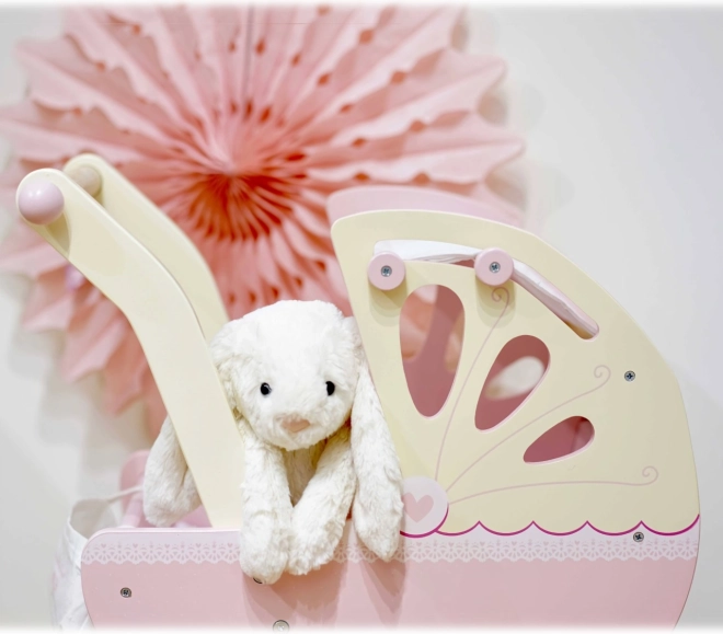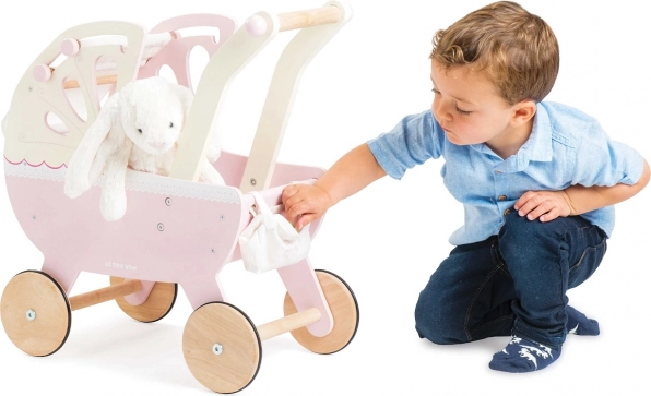 Stijlvolle houten poppenwagen Sweet Dreams van LE TOY VAN in pastelroze, met een traditionele uitstraling en hoogwaardige afwerking. Biedt een stevige constructie, een zacht matras, een met de hand genaaide uitschuifbare hemel en stille rubberen wielen voor soepel rijden op zowel tapijt als harde vloeren. Inclusief een schattige luiertas. Ethisch geproduceerd van FSC-hout en geverfd met niet-giftige verf.
