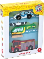 Houten reddingsvoertuigen van Le Toy Van bieden kinderen de mogelijkheid voor fantasierijk spel. Bevat drie voertuigen - helikopter, politieauto en brandweerauto, gemaakt van duurzaam rubberhout met niet-giftige waterbasisverf. Ideaal cadeau voor jonge brandweerlieden, piloten en politieagenten.