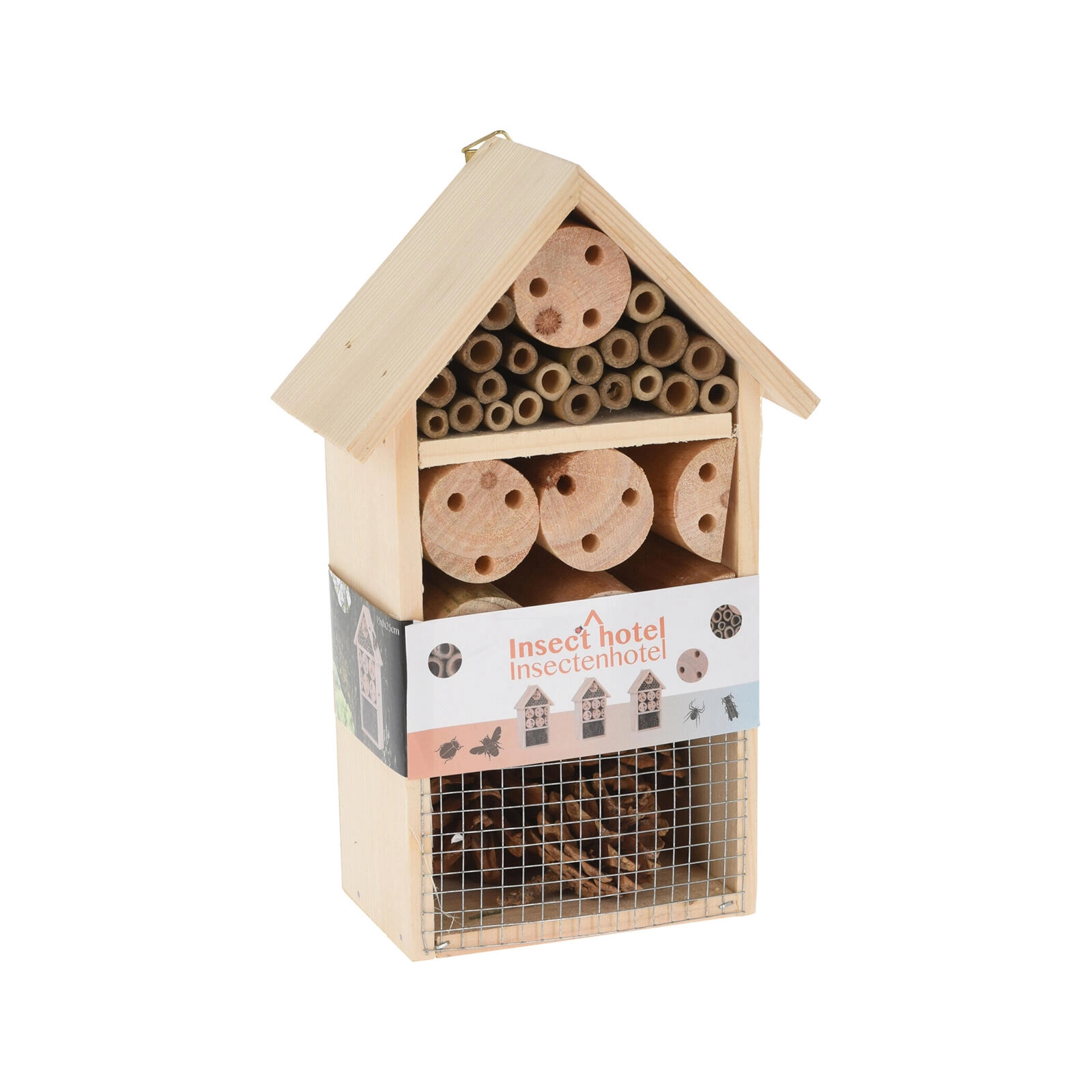 Voor het beste resultaat plaats je het hotel op een zonnige en beschutte plek, bij voorkeur 1–2 m boven de grond, met vrije toegang aan de voorzijde. Controleer regelmatig de staat en houd de omgeving droog voor een lange levensduur van het hout.