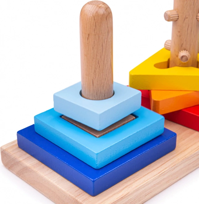 Elk pinnetje heeft een andere constructie voor cirkels, driehoeken en vierkanten – kinderen moeten de stukjes correct plaatsen en vaak ook draaien.