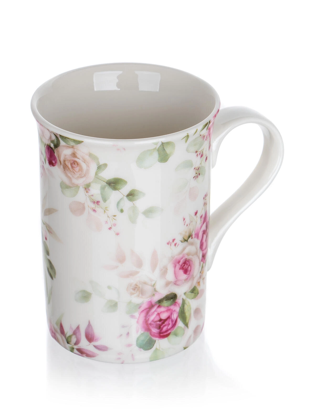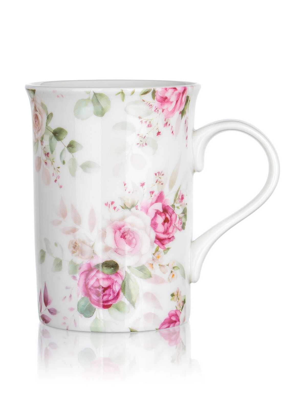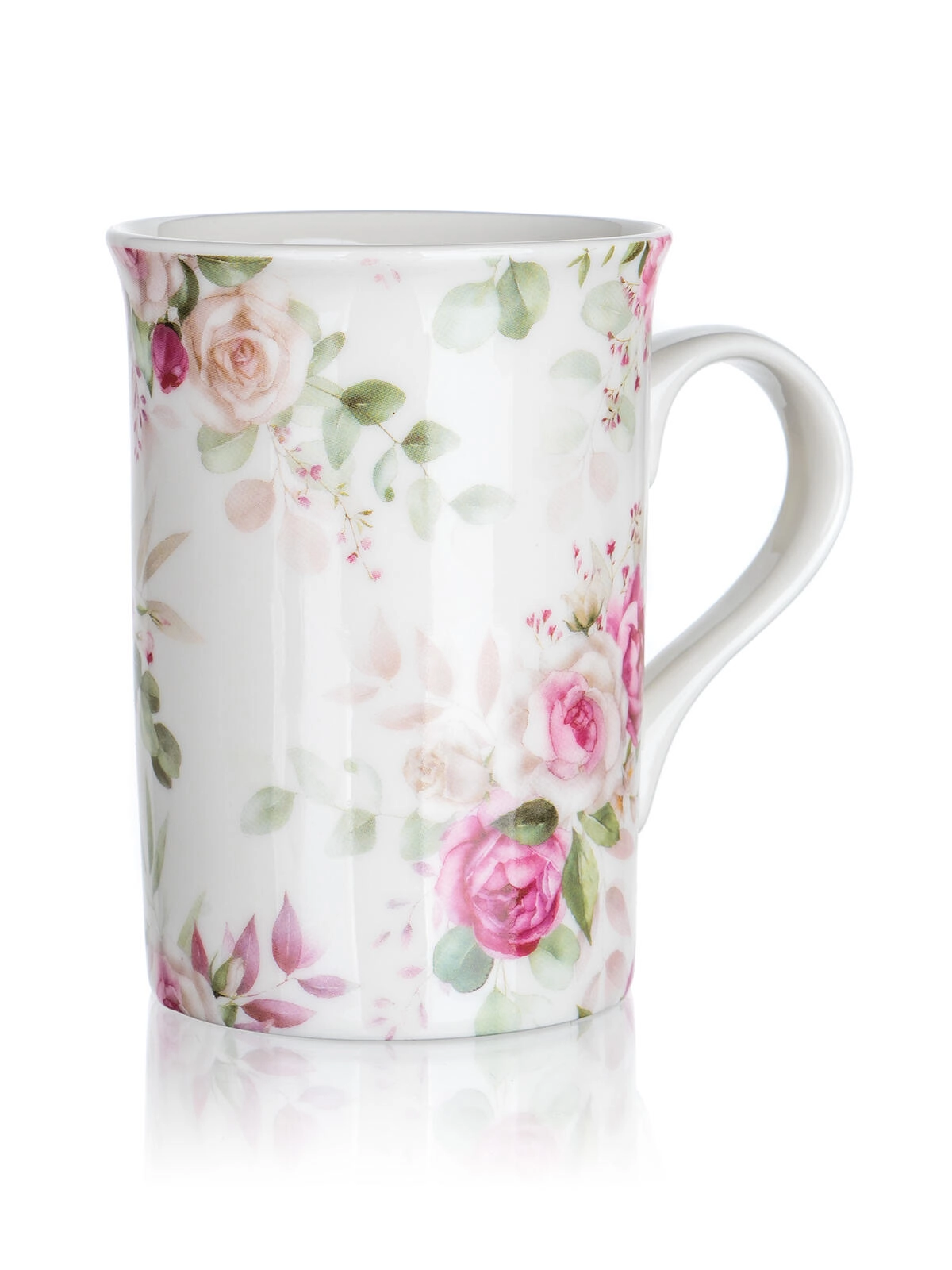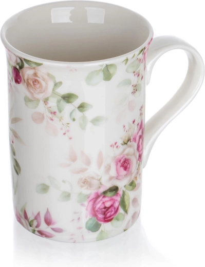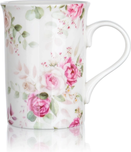 Ruime keramische mok met comfortabele oor en rozenmotief, ideaal voor thee en koffie. Houdt je drankje prettig warm en ligt goed in de hand.