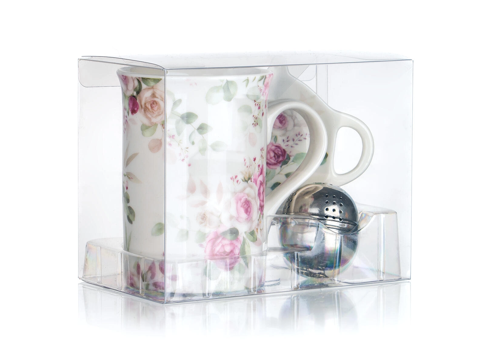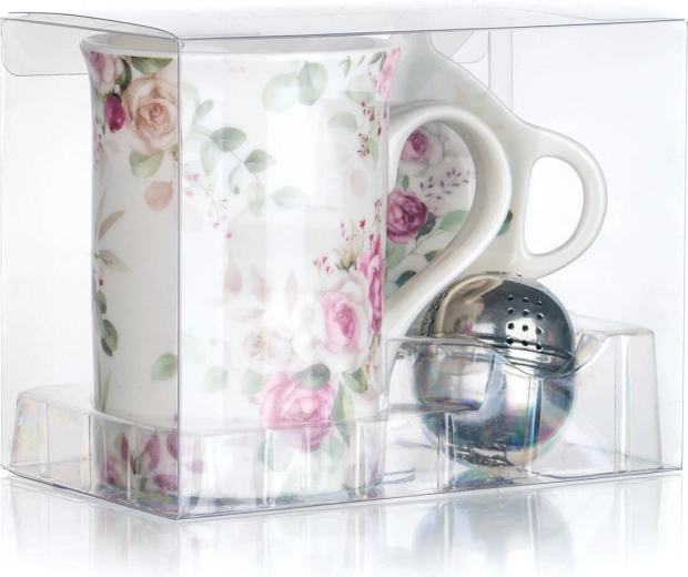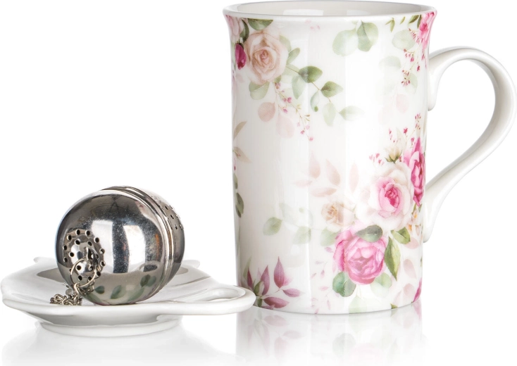 Een elegante theeset met rozenmotief die liefhebbers van thee en mooi servies zal bekoren. Bevat een keramische mok van 340 ml, een praktische roestvrijstalen zeef voor losse thee en een keramisch schaaltje om de zeef op te leggen. Tijdloos bloemenontwerp, comfortabele grip en eenvoudig onderhoud maken dit de ideale aanvulling voor dagelijkse ontspanningsmomenten.