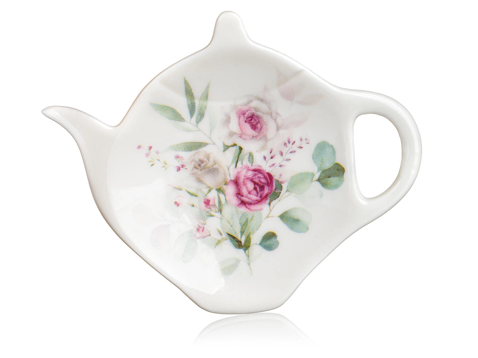 Praktisch klein schaaltje in de vorm van een theepotje om de zeef na het trekken op te leggen. Houdt het werkblad schoon en past bij het bloemendecor van de mok.