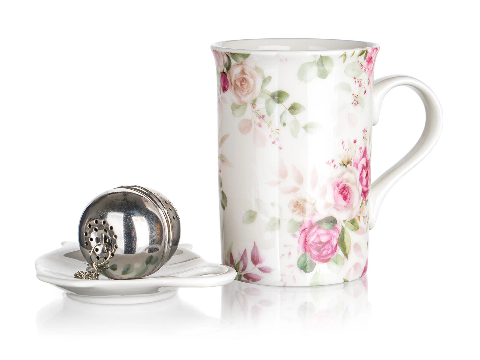 Deze romantische theeset met rozenmotief brengt stijl en comfort in je theepauzes. De ruime mok van 340 ml is ideaal voor ochtendthee of een koffie in de namiddag, de roestvrijstalen zeef zorgt voor een heldere infusie van losse melanges en het keramische schaaltje houdt de tafel vrij van druppels.