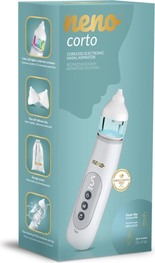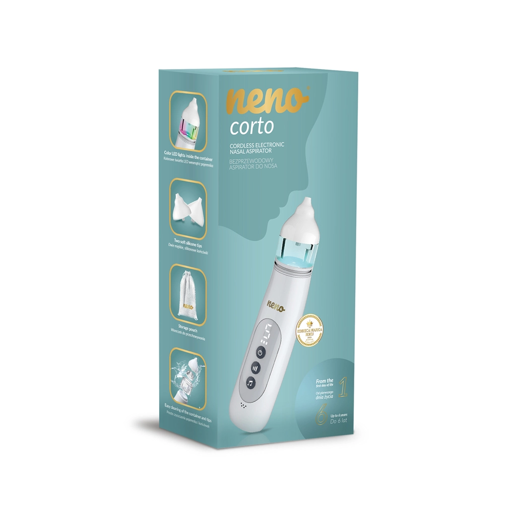 Neno Corto is een compacte, draadloze neusaspirator ontworpen voor baby’s en peuters vanaf de eerste levensdagen. Verwijdert slijm zacht en effectief zonder het gevoelige neusslijmvlies te irriteren. Het overzichtelijke display, de eenvoudige bediening en 5 niveaus zuigkracht maken het mogelijk het vermogen af te stemmen op de leeftijd en de actuele behoeften van het kind.