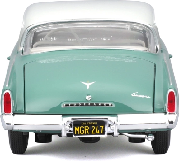Verchroomde elementen, een natuurgetrouw dashboard en een elegante groen-witte kleurencombinatie benadrukken de klassieke lijnen van de Studebaker uit 1953.