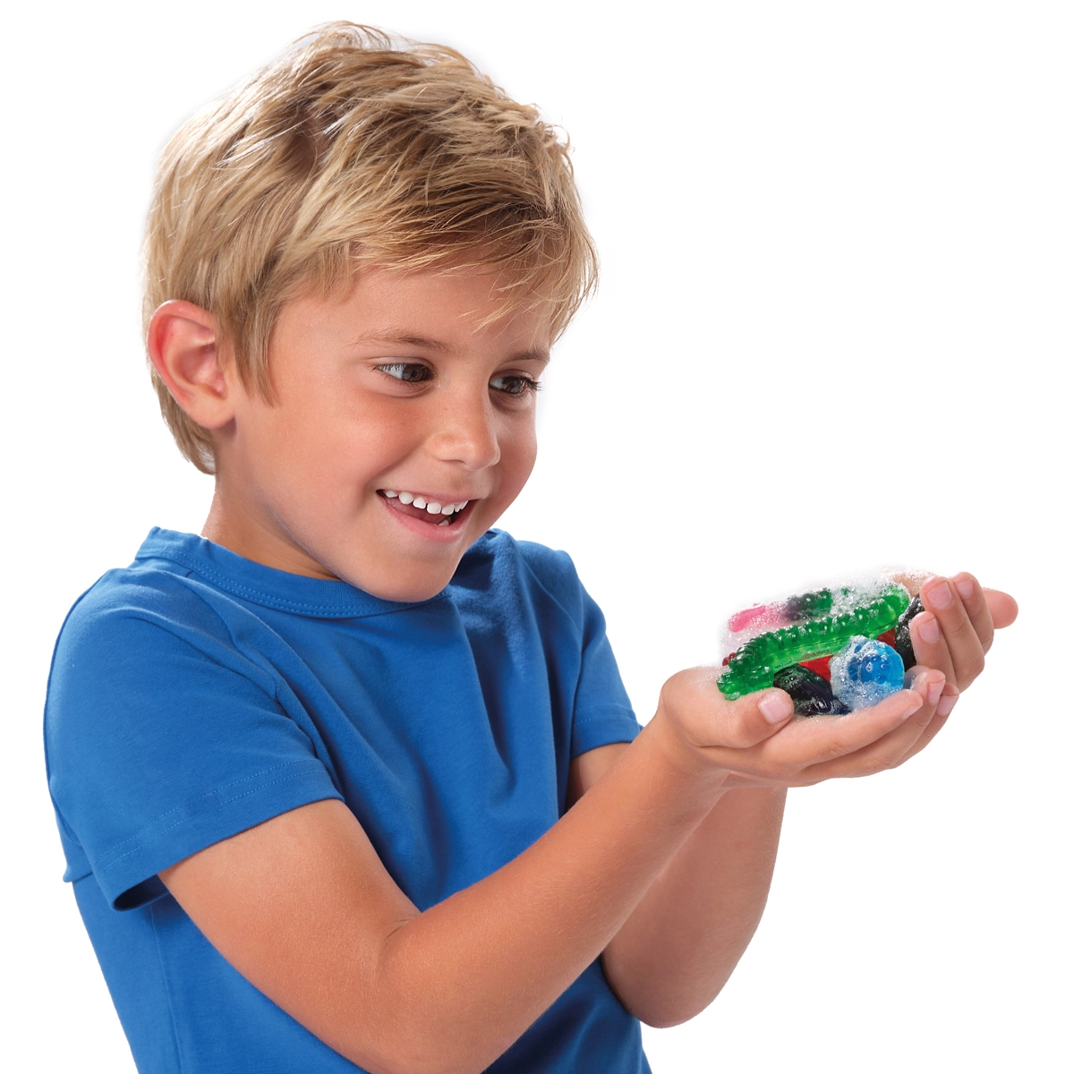 - Zeep om te smelten, rode kleurstof 5 ml, blauwe kleurstof 5 ml, gele kleurstof 5 ml, mal met insectenvormen, pipet, gebruiksaanwijzing