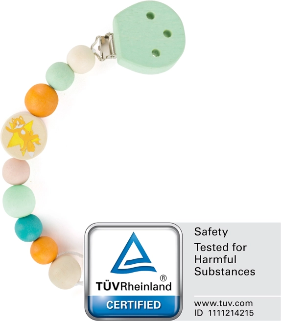 Praktische en stijlvolle speenclip van natuurlijk hout houdt de speen altijd binnen handbereik en schoon. Hij is speekselbestendig, gemaakt van veilige, niet-giftige materialen en de gekleurde kralen met vormen ondersteunen de ontwikkeling van de fijne motoriek vanaf de geboorte.