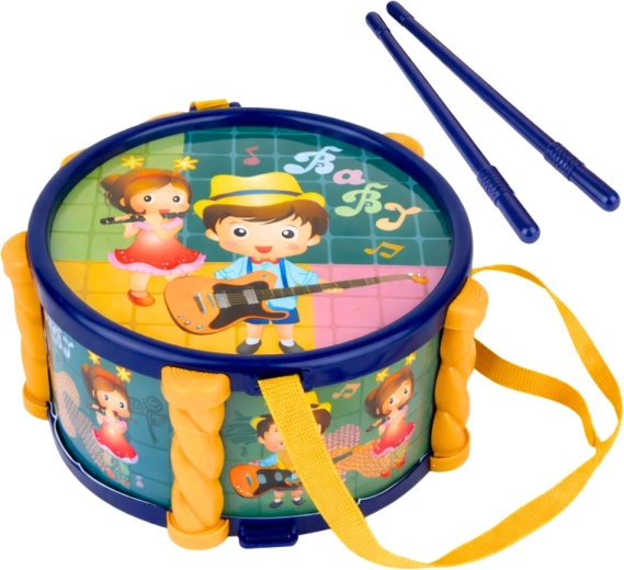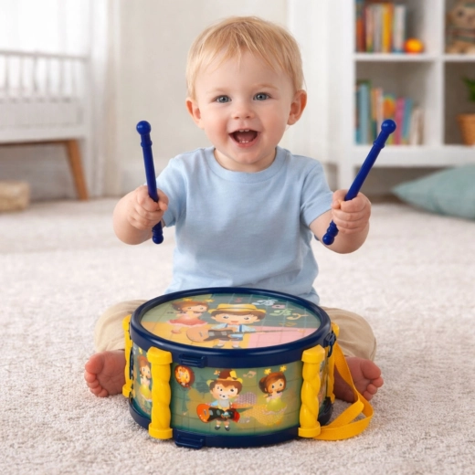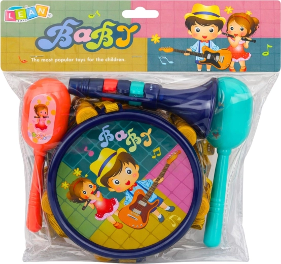Een kleurrijke set muzikale instrumenten voor kinderen die creativiteit, ritme en gehoor stimuleert vanaf jonge leeftijd. Bevat een trommel met stokjes, 2 rammelaars en een trompetje. Lichtgewicht, veilige materialen en vrolijke graphics nodigen uit tot spelen, thuis en onderweg.