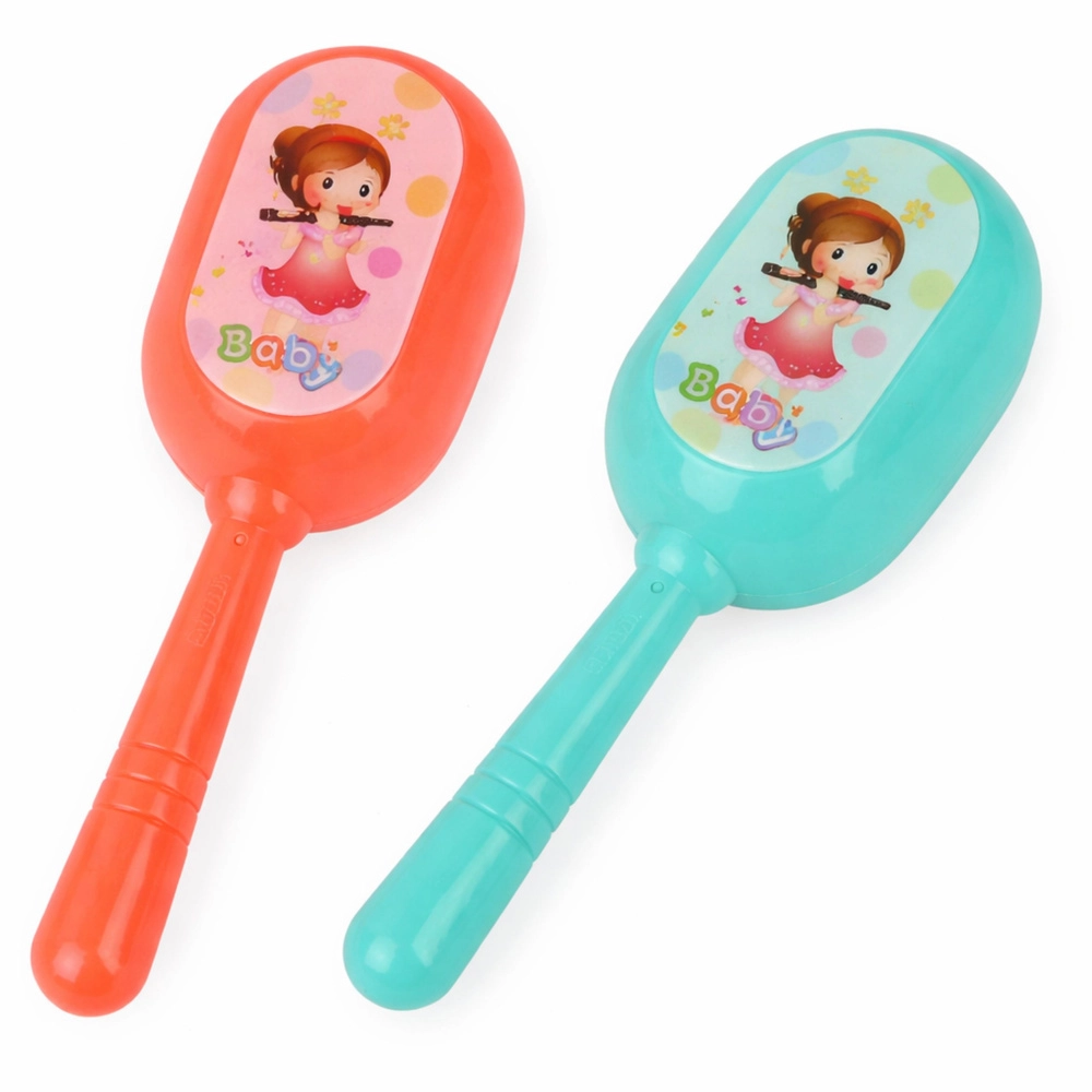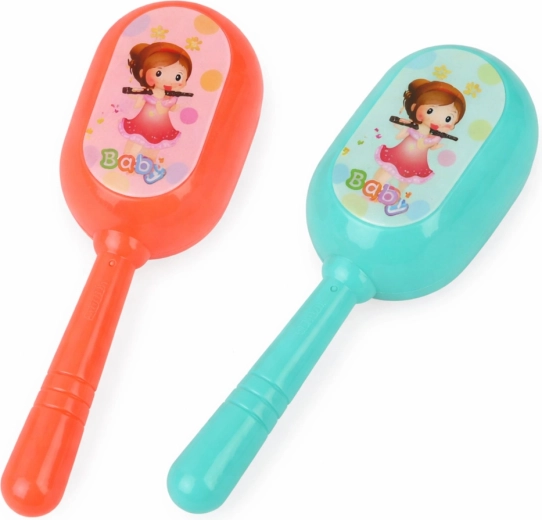 Twee ergonomische rammelaars die in kleine handjes passen en het ritmegevoel en de fijne motoriek stimuleren.