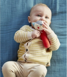 De rammelaar is gemaakt van organisch GOTS-gecertificeerd katoen en geverfd met plantaardige kleurstoffen, waardoor het zacht is voor de babyhuid en vriendelijk voor het milieu. Perfect voor dagelijks spelen en als vermaak voor onderweg.
