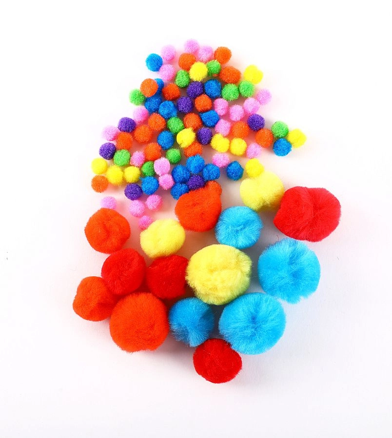 Voeg volume, structuur en expressie toe. Pompons in verschillende maten en zelfklevende wiebeloogjes veranderen elk werkje in een uniek figuurtje.