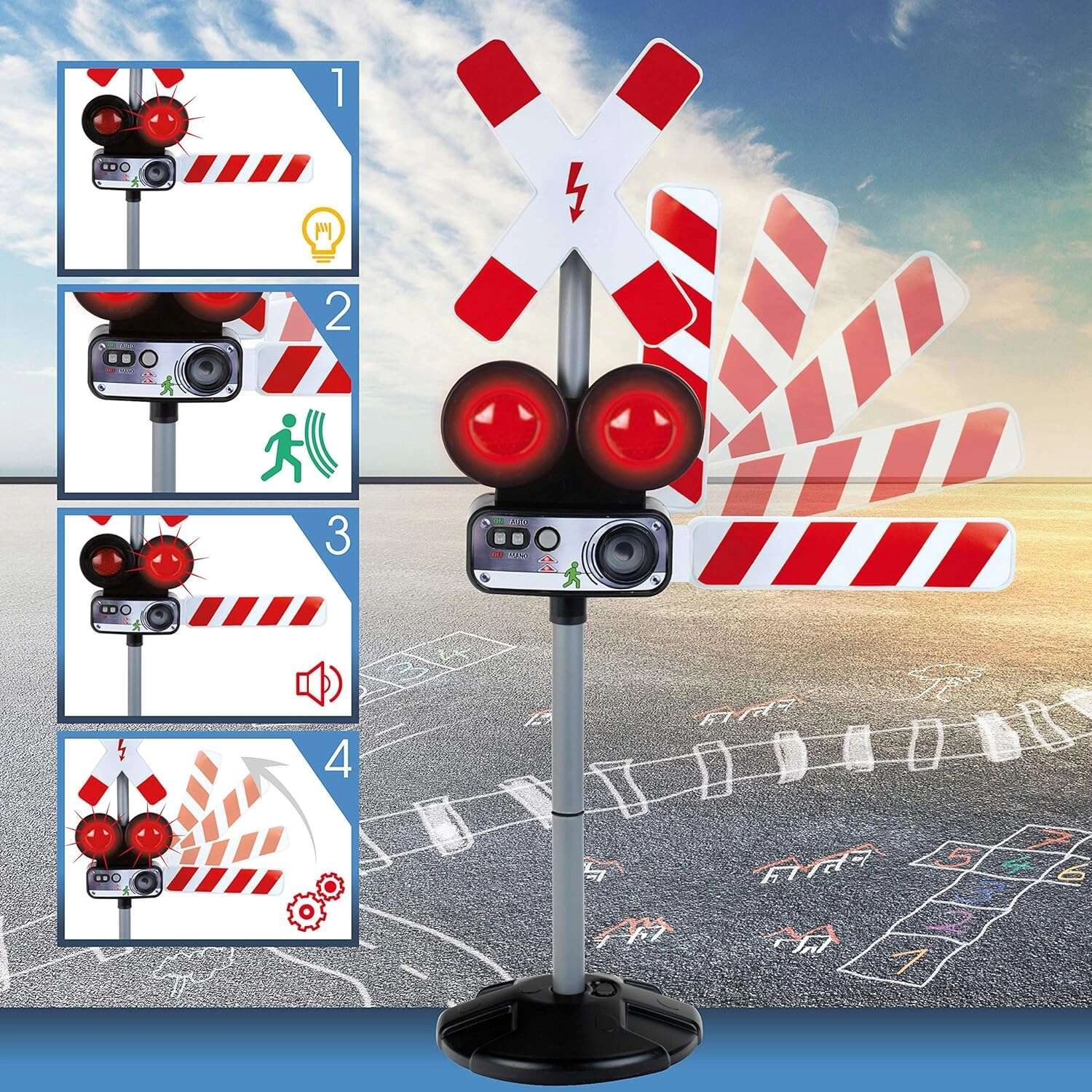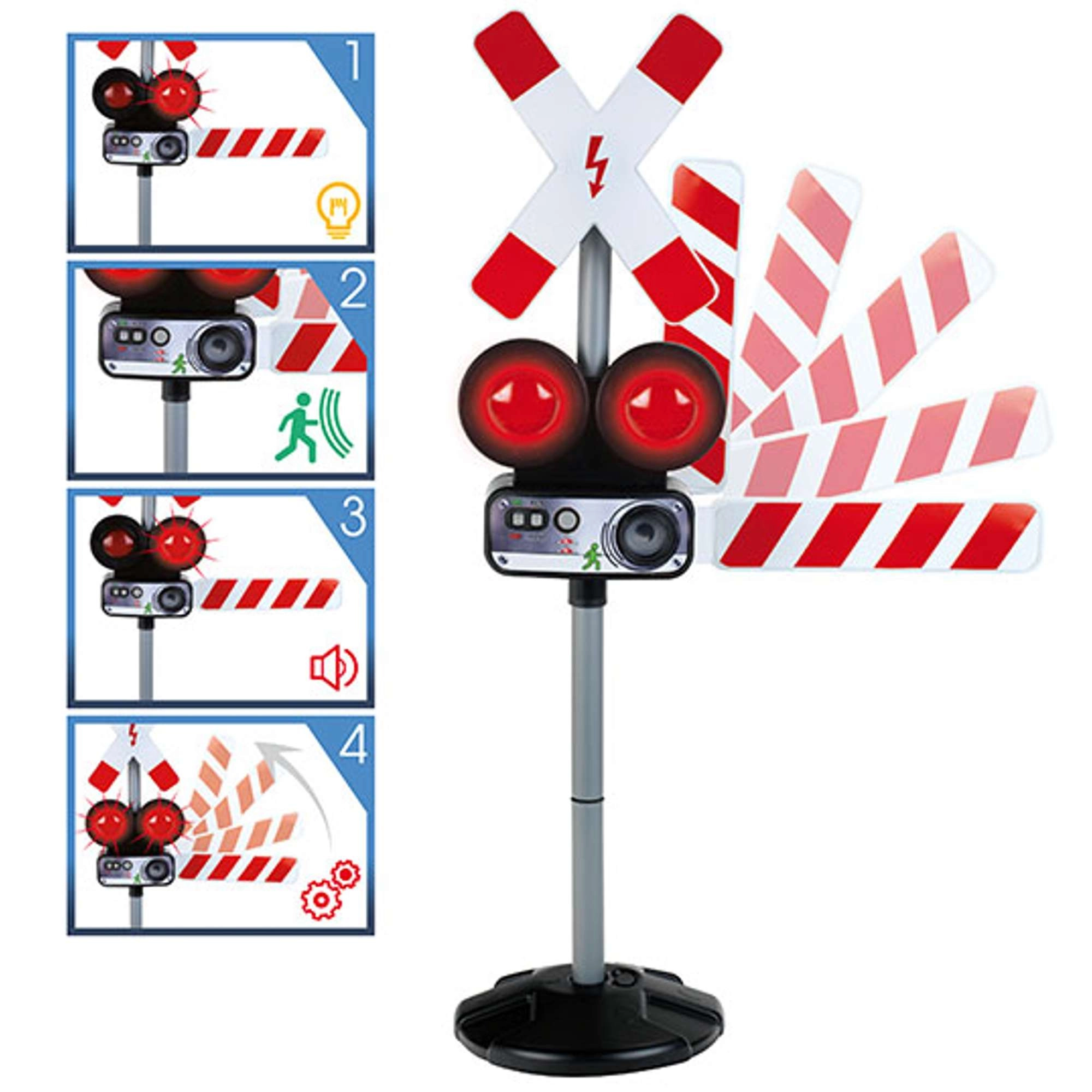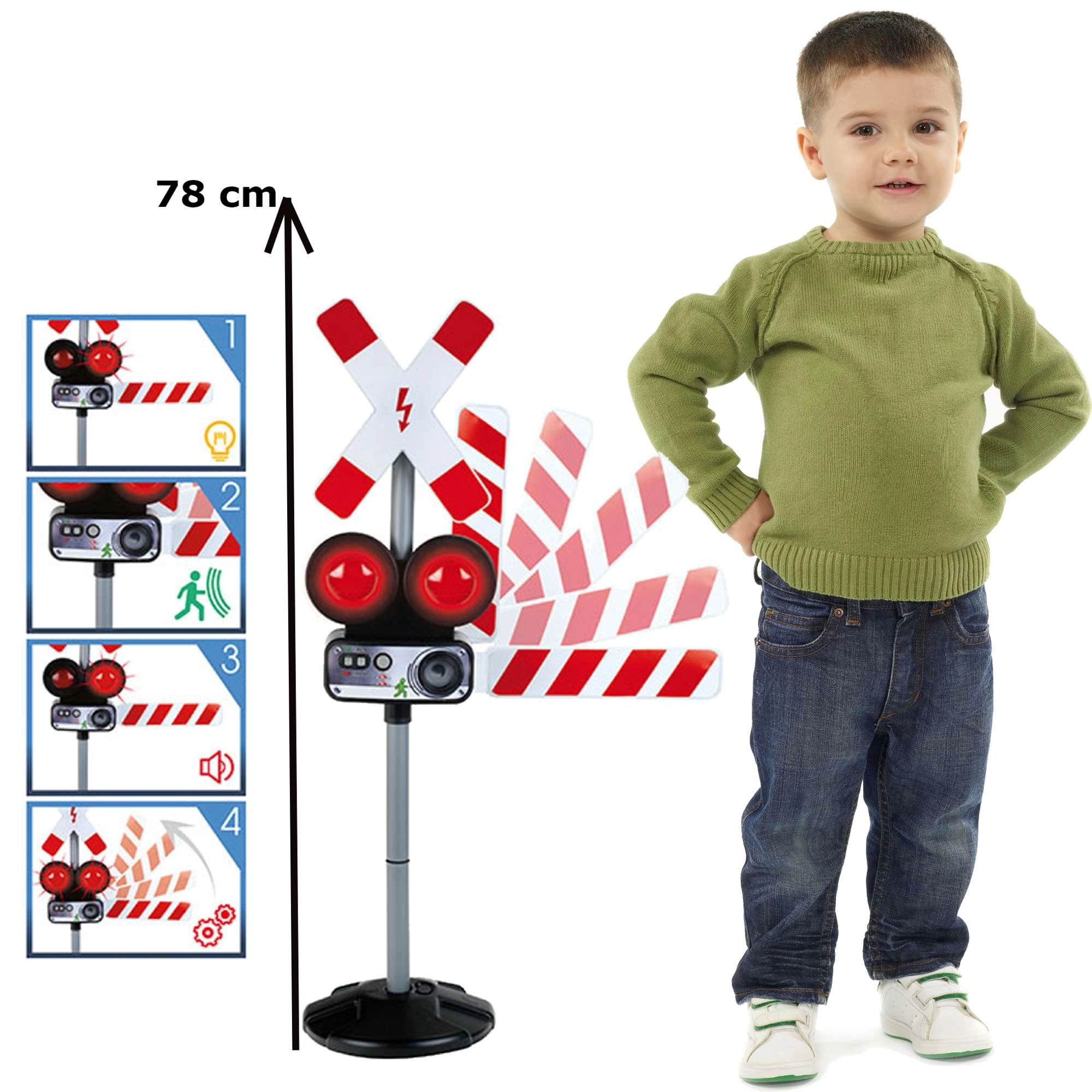 De signalering kan handmatig of met de bewegingssensor worden geactiveerd. Een stabiele basis en hoogwaardige afwerking zorgen voor een lange levensduur, zelfs bij dagelijks spelen. De hoogte van 78 cm versterkt het realistische effect en past perfect bij treinbanen en verkeerssets.