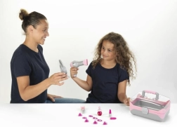 De set is gelicentieerd door Braun en verpakt in een stijlvolle koffer met transparant deksel voor gemakkelijke opslag en orde. De koffer is gemaakt van hoogwaardig plastic, heeft een ergonomische handgreep en een sluiting die het gesloten houdt. Alle apparaten komen overeen met echte Braun FuturPro Ion-Care producten en de föhn is uitgerust met een opzetstuk voor haarversteviging. Het is de perfecte set voor de veeleisende, professionele kleine kapster.