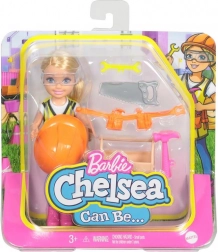 Elke Chelsea-pop in een bouwrol is uitgerust met een veiligheidsvest, helm en gereedschappen zoals een zaag of sleutel.