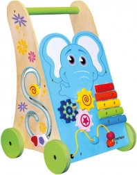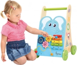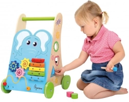 Het multifunctionele houten loopwagentje van Bino helpt kinderen zelfverzekerder te gaan staan en ontwikkelt tegelijk de fijne motoriek, oog-handcoördinatie en het gehoor. Dankzij de combinatie van activiteiten – xylofoon, vormenstoof, kralenlabyrint en tandwielmechanisme – is elk spel boeiend en leerzaam.