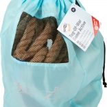 De turkooizen zak met gaasvenster maakt het makkelijk om het touw na het spel te dragen en op te bergen.