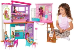 Ontdek de eindeloze mogelijkheden die het Barbie Vakantiehuis biedt. Dit huis met twee verdiepingen omvat slaapkamer, badkamer, keuken, eetkamer, woonkamer en kleedkamer. Modern design en de specifieke Barbie stijl inspireren kinderen tot creatieve verhalen.