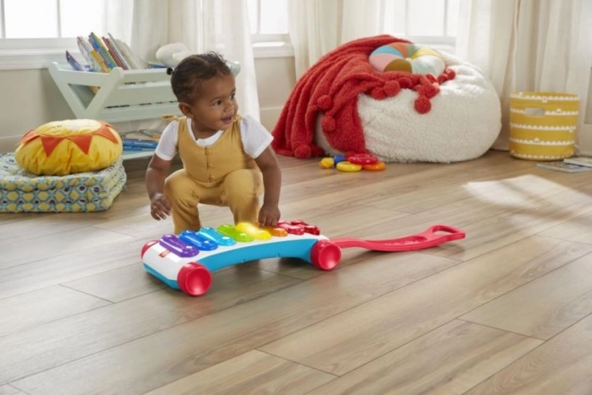 De grote educatieve xylofoon van Fisher-Price is een nieuwe versie van het klassieke trek-speelgoed, nu met nog meer plezier! Deze extra grote interactieve xylofoon heeft 8 verlichte toetsen die meer dan 60 geluidsactiveringen starten, waaronder verschillende geluiden, liedjes en zinnen. Het speelgoed is voorzien van een stevige, inklapbare hendel, zodat kleine muzikanten zowel zittend kunnen spelen als met de xylofoon kunnen rondlopen. Dankzij de Leer­niveaus-technologie kan de speelwijze worden aangepast naarmate het kind groeit. Educatieve zinnetjes en liedjes leren onder meer het alfabet, cijfers en vormen, maar ook eenvoudige woorden in het Engels. Druk op de wereldbolknop om de taal te kiezen: Tsjechisch, Pools, Hongaars, Slowaaks of Engels.