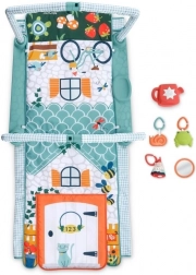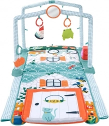 Spiegel, rammelaar, BPA-vrije bijtring, knisperend speeltje en schommelende gieter. Het zachte kleed is ruim en machinewasbaar.