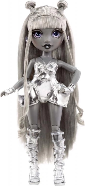 Lange zilverkleurige haren, metallic texturen en een moderne outfit maken van Luna een opvallende ster van SHADOW HIGH – ideaal voor modieuze styling en fotoshoots.