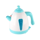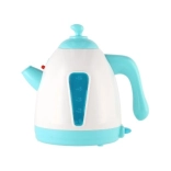 De waterkoker is ontworpen als een echt keukenapparaat met een elegante witte en turquoise kleurstelling.