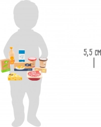 De set bevat sinaasappelsap, twee bakjes ijs, een verpakking doperwten, vissticks, boter, kaas, plakjes worst en een melkpak. Realistische prints en een natuurlijke look vallen meteen op. Dankzij het stevige hout is de set duurzaam en klaar voor dagelijks spelen.