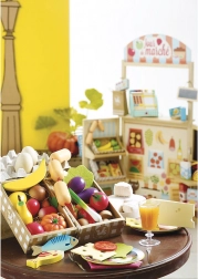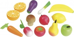 In de doos vind je een wortel, citroen, radijs, prei, aubergine, champignon, tomaat, banaan, appel, peer, aardbei en twee halve sinaasappels. Kinderen kunnen zo spelenderwijs kleuren, vormen en het sorteren van voedsel oefenen.