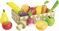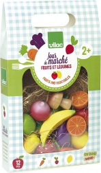 Speelse set voor kleine koks en winkeliers: houten fruit en groenten van het merk VILAC in een stevige kartonnen doos. Bevat 12 realistische stuks met fijne viltdetails, ideaal voor het stimuleren van fantasie, motoriek en rollenspel in de winkel.