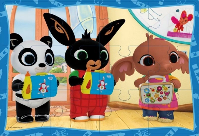 Deze geweldige puzzelset is ideaal voor kinderen die houden van Bing en zijn avonturen. Het bestaat uit 24 stukken en stelt je in staat om twee scènes uit de favoriete serie te maken.