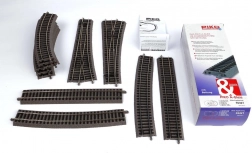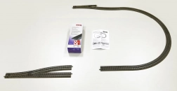 Set van rails met gedetailleerde reproductie van houten dwarsliggers op een ballastbedding, authentieke kleuren, parallelle boog en twee wissels. Ideaal voor de constructie van een onafhankelijk aangedreven ovaal.