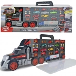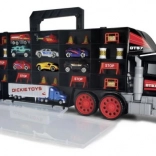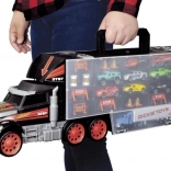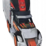De enorme vrachtwagenkoffer combineert een opbergbox en een speelset in één. De openklapbare compartimenten bieden plaats aan de volledige set voertuigen en accessoires, en de praktische handgreep maakt dragen eenvoudig. Het handmatige lanceermechanisme in de cabine verandert de vrachtwagen in een racebaan en zorgt voor actievolle starts.