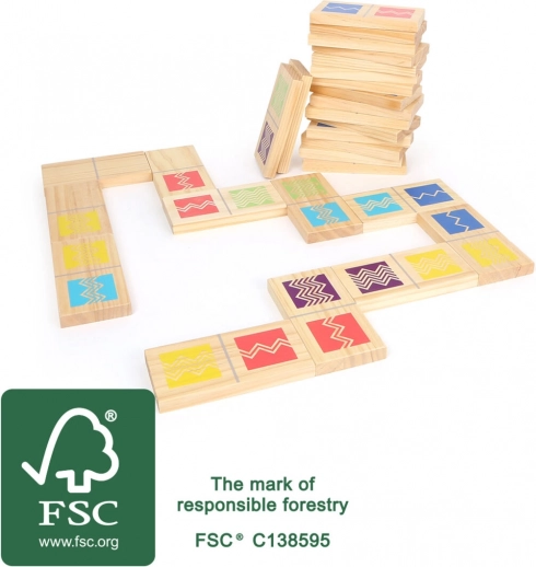 Geniet van extra veel plezier met dit XXL domino van hoogwaardig FSC-hout. De set met 28 stenen biedt spel op kleur- én patroonovereenkomst, en stimuleert fijne motoriek, logisch denken en kleurherkenning. De stukken zijn groot, stevig en veilig voor kinderen vanaf 3 jaar. Ideaal voor binnen en buiten. FSC-certificering, 28 extra grote stenen, kleuren en gearceerde patronen, geschikt voor de allerkleinsten.