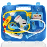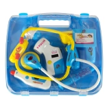 De set bevat medische instrumenten zoals een stethoscoop, thermometer, bloeddrukmeter, oorinstrument, spuit, hamertje, doktersbadge en een keelcontrole-instrument met verlichting.