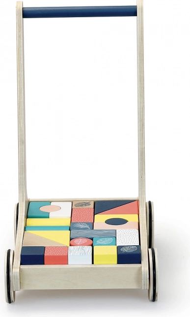 24 blokken in verschillende vormen zijn in de wagen inbegrepen, wat kinderen talloze mogelijkheden biedt voor creatief spel. De loopwagen heeft een modern design met een blauw handvat en witte illustraties.