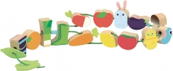 De set met 14 geïllustreerde kralen (bijv. aubergine, tomaat, vogeltje, laarzen) prikkelt de fantasie en helpt bij het leren van kleuren en benoemen.