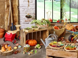- 14 houten kralen met boerderijmotieven (groente, fruit, dieren, laarzen enz.)